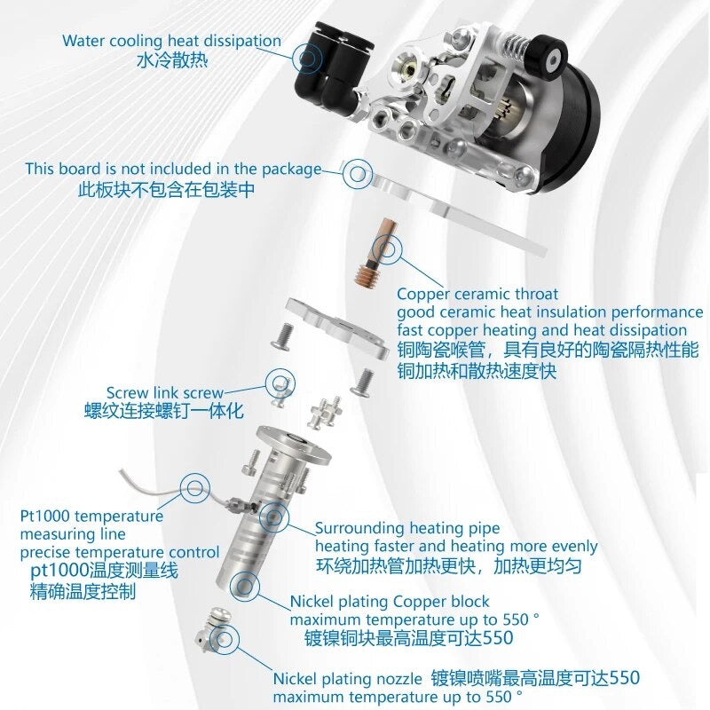 The water cooling structure can cool the hot end and the motor at the same time, improving the printing performance of the hot end and ensuring stable operation of the motor under high temperature conditions, thus improving the stability and reliability of the machine.