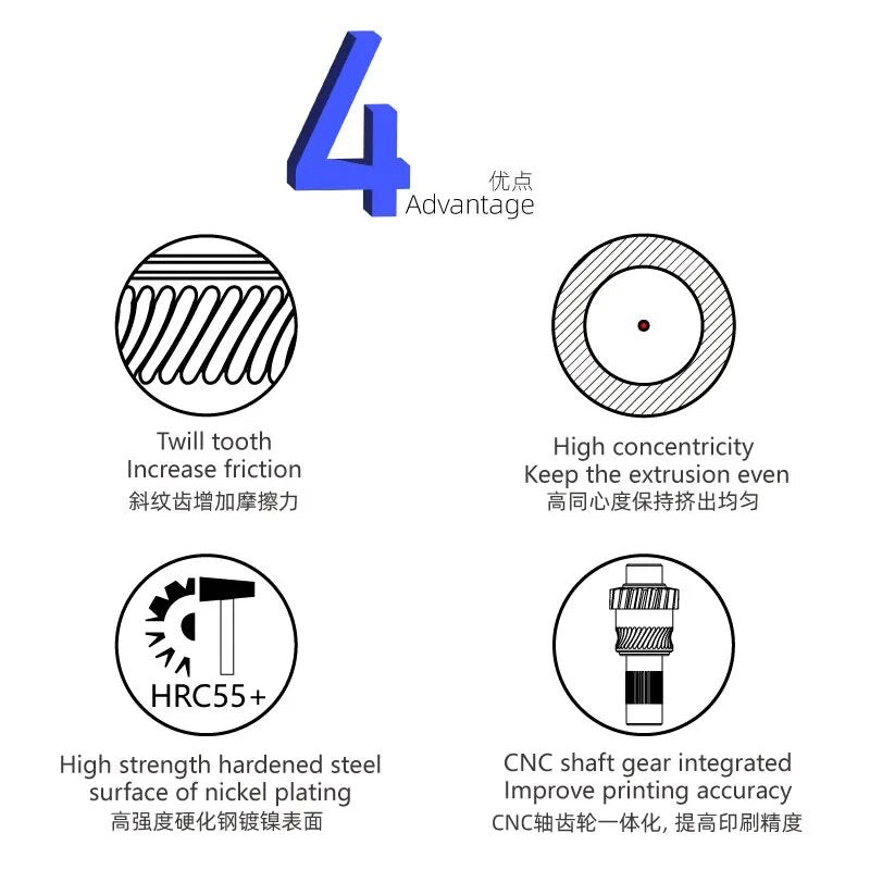 Innovative Gear Design: Made from hardened steel with a strength rating of 55, featuring high-precision CNC machined reduction gears for enduring long printing sessions without damage and enhancing extrusion accuracy.