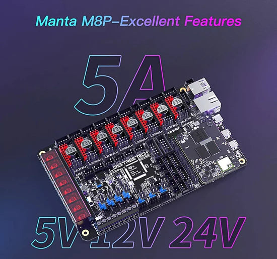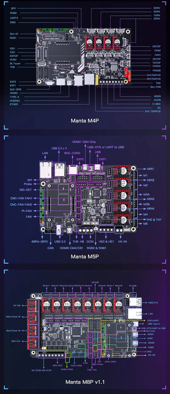Big Tree Tech Manta boards are a fully integrated alternative to the Raspberry Pi by using their CB1 module. There are two versions of Manta boards. The first one has 4 drivers (M4P) which is now being replaced by the M5p 5 driver and the second one has 8 drivers (M8P). The powerful CB1 Raspberry pi alternative features a Quad-core 64-bit ARM Cortex-A53 with a 1.5 GHz processor and 1 GB DDR3 RAM. Together with the optional CB1 Heatsink provides for an excellent platform to run Klipper on the most demanding printers.