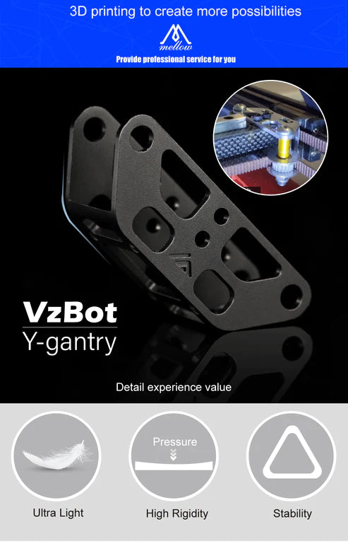 This is VzBot Aluminum Y gantry, which has undergone high-precision CNC processing and anodized surface treatment. Accurate size, perfectly adapted to VzBot 3D Printer. The aluminum CNC production contains rigidity and is very light in weight, which is nearly 20g less than the original print. This product reduces weight while reducing vibration. It can help VzBot 3D printers to ensure high quality while achieving faster printing.