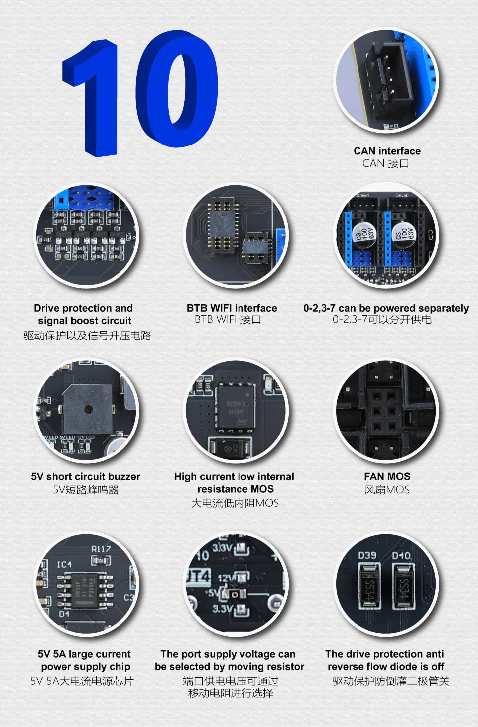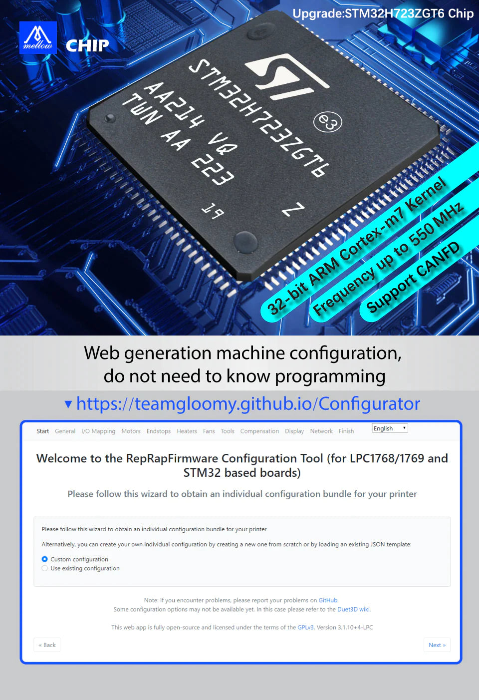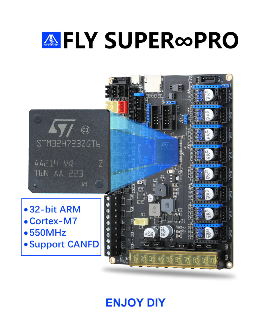 The Mellow High-speed Super ♾️ board comes with a powerful 32-bit ARM Cortex-M7 Kernel 550MHz and STM32H723ZGT6 Chip for advanced performance. It also supports CANFD, onboard WiFi with 2.4m/s speeds, 8 independent motor drives with high voltage, 5 extruders, 10 PWM fans, and a unique PWM Fan MOS board with direct replacement and four pin PWM fan. Firmware is Reprap/Klipper and it has drivers for A4988, LV8729, DRV8225, TMC2208 / 2209/5160 and touchscreen, 12864 LCD, 2004 LCD, FLY displays. Automatic bed leveling sensor BLTouch is also supported, as well as 5V / 12V / 24V limit switch power supply.